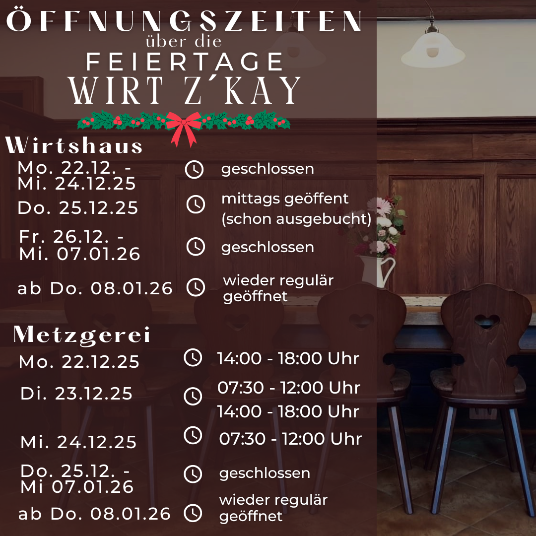 - separate Abholspeisekarte zu den Wirtshaus – Öffnungszeiten, von 17:00 bis 20:00 -> Einfach unter +498683-7824 bestellen
